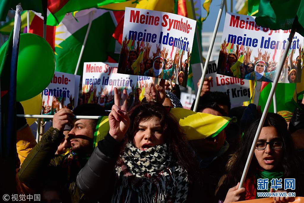 當(dāng)?shù)貢r(shí)間2018年3月3日,德國柏林,當(dāng)?shù)孛癖娕e行游行,抗議土耳其對(duì)敘利亞阿夫林地區(qū)的庫爾德人采取軍事行動(dòng)。(圖片來源:視覺中國)