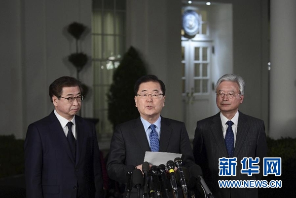 3月8日,正在美國訪問的韓國青瓦臺國家安保室室長鄭義溶(中)在華盛頓白宮說,朝鮮最高領導人金正恩委托韓方向美方轉(zhuǎn)達他希望盡快與美國總統(tǒng)特朗普會面的意愿,特朗普已經(jīng)同意在5月之前與金正恩會面。新華社/美聯(lián)
