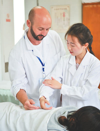 2017年7月,11名西班牙“洋中醫(yī)”來(lái)到位于昆明市的云南省中醫(yī)院學(xué)習(xí)推拿和針灸。圖為中國(guó)老師指導(dǎo)“洋中醫(yī)”。人民視覺