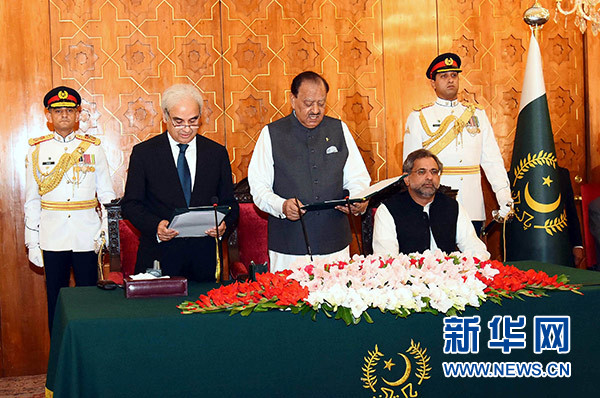 6月1日,在巴基斯坦伊斯蘭堡,納賽爾·穆?tīng)柨耍ㄇ白螅┬木腿伟瓦^(guò)渡政府總理。新華社發(fā)