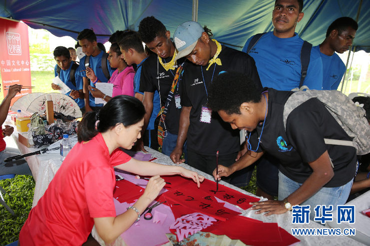 斐濟青年正在中國文化中心老師的指導下用毛筆寫自己的姓名。 新華網(wǎng)記者張永興 攝