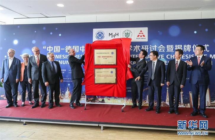 6月8日,在德國(guó)漢諾威,嘉賓為中國(guó)—德國(guó)中醫(yī)藥中心揭牌。新華社記者單宇琦 攝