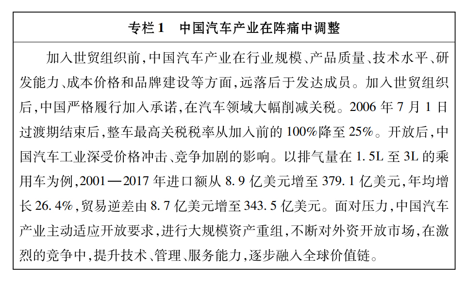 中國(guó)在加入世貿(mào)組織時(shí)作出廣泛而深入的開(kāi)放承諾,國(guó)內(nèi)企業(yè)直接面對(duì)國(guó)際競(jìng)爭(zhēng),多數(shù)產(chǎn)業(yè)面臨較大困難。中國(guó)企業(yè)主動(dòng)應(yīng)對(duì)挑戰(zhàn),大力推進(jìn)產(chǎn)業(yè)結(jié)構(gòu)調(diào)整,積極參與全球價(jià)值鏈,國(guó)際競(jìng)爭(zhēng)力明顯提升。