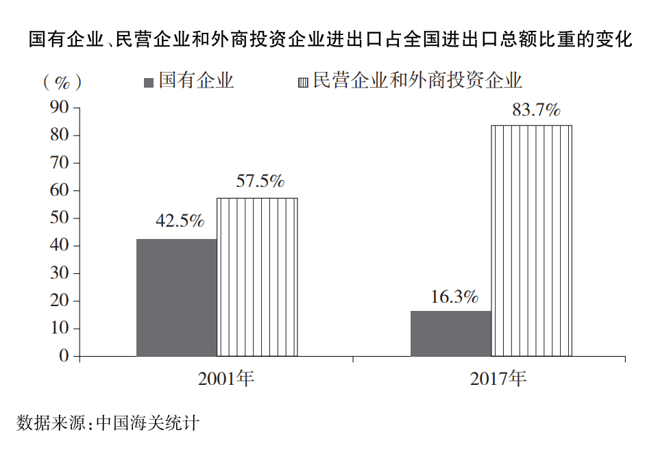 全面放開(kāi)外貿(mào)經(jīng)營(yíng)權(quán)。促進(jìn)經(jīng)營(yíng)主體多元化,激發(fā)各類企業(yè)開(kāi)展貿(mào)易的積極性。自2004年7月起,中國(guó)對(duì)企業(yè)的外貿(mào)經(jīng)營(yíng)權(quán)由審批制改為備案登記制,極大地釋放了民營(yíng)企業(yè)的外貿(mào)活力,民營(yíng)企業(yè)進(jìn)出口發(fā)展迅速,份額持續(xù)擴(kuò)大,成為對(duì)外貿(mào)易的重要經(jīng)營(yíng)主體。民營(yíng)企業(yè)和外商投資企業(yè)進(jìn)出口占全國(guó)進(jìn)出口總額的比重由2001年的57.5%上升到2017年的83.7%。2017年,作為第一大出口經(jīng)營(yíng)主體的民營(yíng)企業(yè)出口占比達(dá)46.6%。