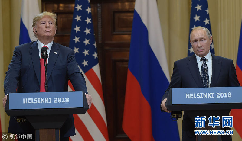 當(dāng)?shù)貢r(shí)間2018年7月16日,芬蘭赫爾辛基,美國(guó)總統(tǒng)特朗普與俄羅斯總統(tǒng)普京出席聯(lián)合新聞發(fā)布會(huì)。(圖片來(lái)源:視覺(jué)中國(guó))