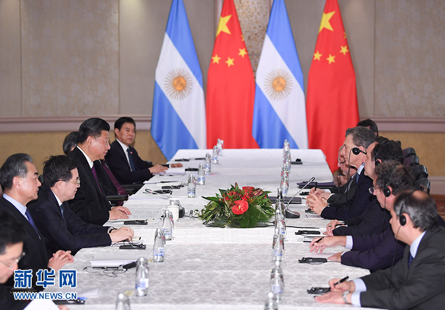 7月26日,國家主席習近平在南非約翰內斯堡會見阿根廷總統馬克里。 新華社記者 燕雁 攝