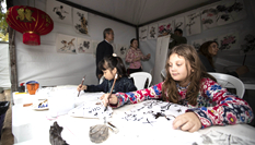 圍繞著中央舞臺,剪紙、書法、針灸等展位前人頭攢動,吸引了許多聞訊而來的華僑華人和當?shù)孛癖姟0臀魍呒铀够饡A人教授夏華聲帶著兩個兒子前來參加活動。