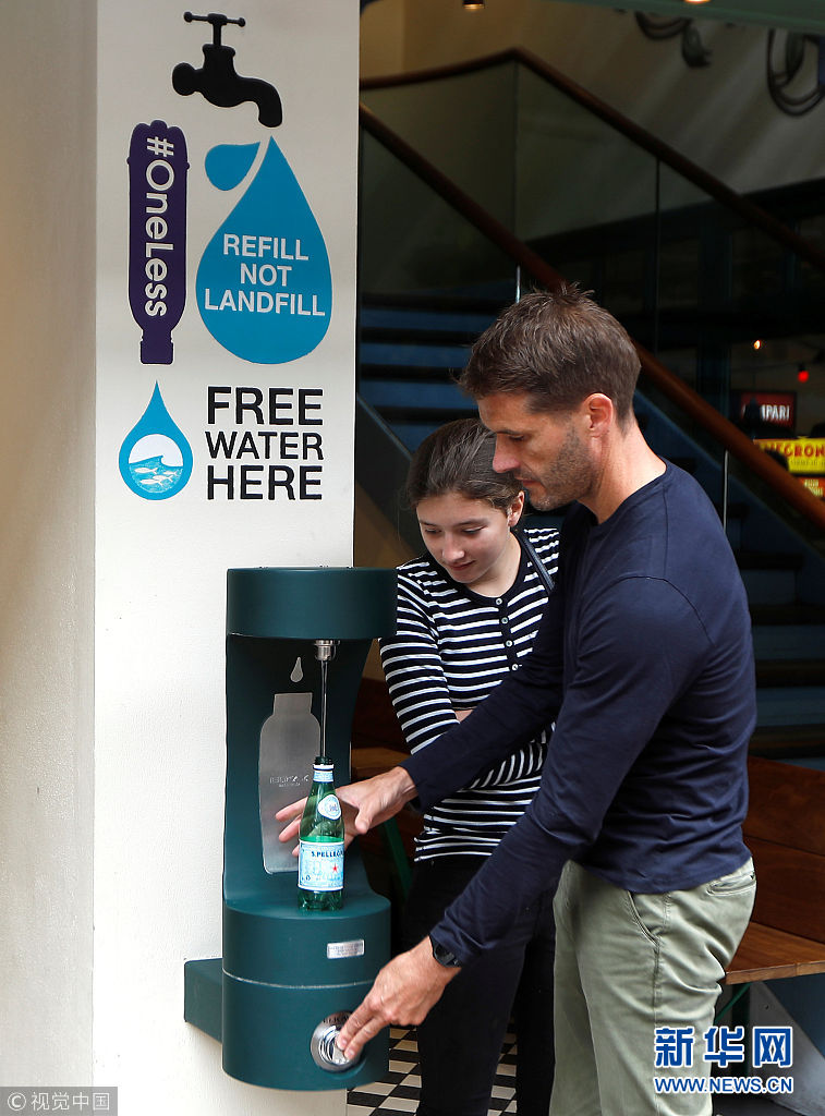 當(dāng)?shù)貢r(shí)間2018年8月28日,英國(guó)倫敦,民眾在公共飲水機(jī)旁飲水。倫敦市長(zhǎng)近日引進(jìn)了20個(gè)新的公共飲水機(jī),鼓勵(lì)人們自帶杯子取水喝,從而減少塑料垃圾。 (圖片來(lái)源:視覺(jué)中國(guó))
