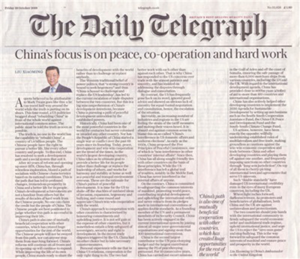 英國時間10月19日,英國主流大報《每日電訊報》紙質(zhì)版和網(wǎng)絡(luò)版同時刊登我駐英國大使劉曉明題為《中國致力于和平、合作與奮斗》的署名文章。全文如下: