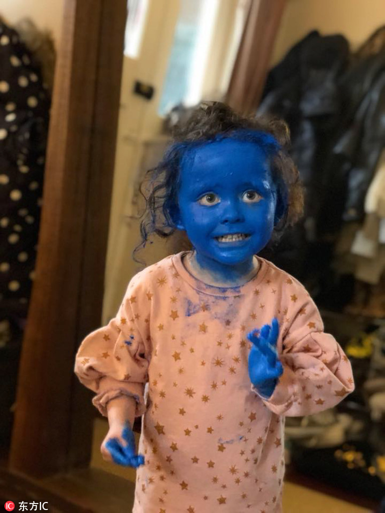 2018年4月17日?qǐng)?bào)道,國(guó)外3歲的小女孩Eve把自己涂抹成了“藍(lán)精靈”?。▓D片來(lái)源:東方IC)