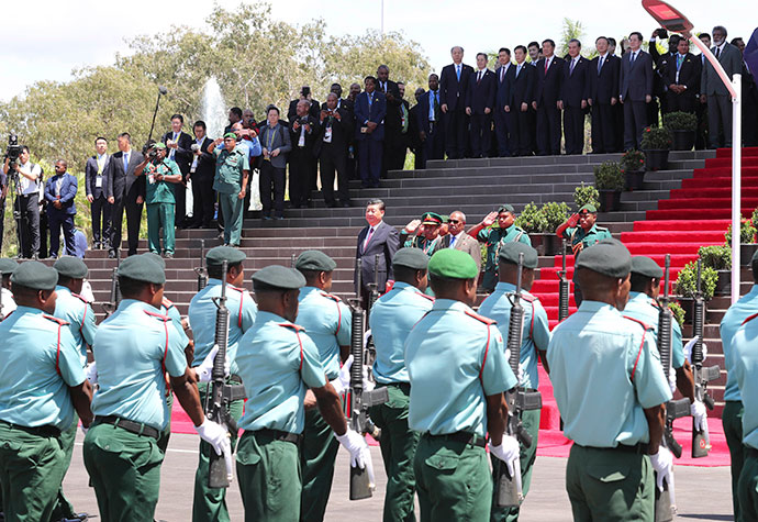 11月16日,國(guó)家主席習(xí)近平在莫爾茲比港會(huì)見巴布亞新幾內(nèi)亞總督達(dá)達(dá)埃。會(huì)見開始前,達(dá)達(dá)埃在議會(huì)大廈前廣場(chǎng)為習(xí)近平舉行隆重歡迎儀式。新華社記者 丁林 攝