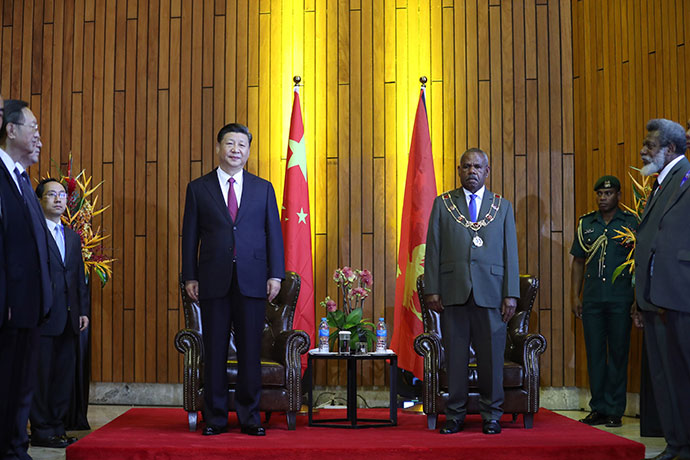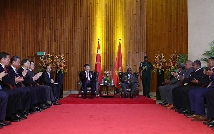11月16日,國(guó)家主席習(xí)近平在莫爾茲比港分別會(huì)見建交太平洋島國(guó)領(lǐng)導(dǎo)人。這是習(xí)近平會(huì)見紐??偫硭?。新華社記者 丁林 攝