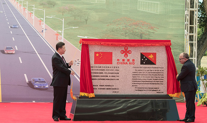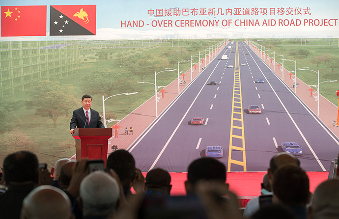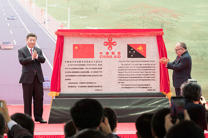 11月16日,國(guó)家主席習(xí)近平在莫爾茲比港和巴布亞新幾內(nèi)亞總理奧尼爾共同出席中國(guó)援建的獨(dú)立大道移交啟用儀式。新華社記者 鞠鵬 攝