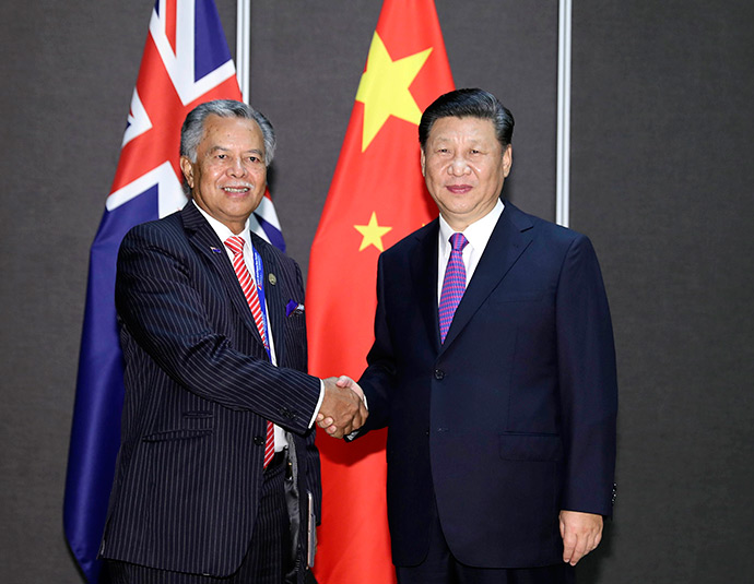 11月16日,國(guó)家主席習(xí)近平在莫爾茲比港分別會(huì)見建交太平洋島國(guó)領(lǐng)導(dǎo)人。這是習(xí)近平會(huì)見庫(kù)克群島總理普納。新華社記者 丁林 攝