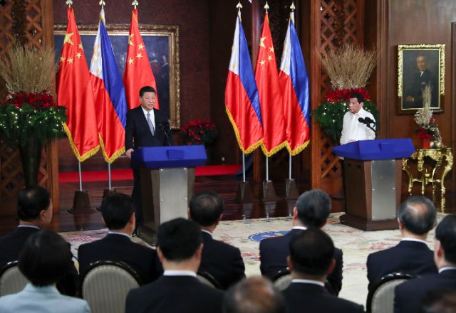 11月20日,國家主席習近平在馬尼拉同菲律賓總統杜特爾特舉行會談。這是會談后,兩國元首共同會見記者。新華社記者謝環(huán)馳攝