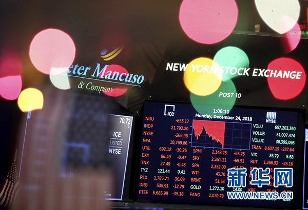 12月24日,美國(guó)紐約證券交易所的電子屏顯示當(dāng)日交易信息。 紐約股市三大股指24日收盤下跌。截至當(dāng)天收盤,道瓊斯工業(yè)平均指數(shù)比前一交易日下跌653.17點(diǎn),收于21792.20點(diǎn),跌幅為2.91%。標(biāo)準(zhǔn)普爾500種股票指數(shù)下跌65.52點(diǎn),收于2351.10點(diǎn),跌幅為2.71%。納斯達(dá)克綜合指數(shù)下跌140.08點(diǎn),收于6192.92點(diǎn),跌幅為2.21%。 新華社記者 王迎 攝