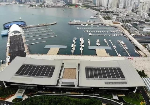 上合青島峰會主會場——青島國際會議中心經(jīng)過短暫的會后內(nèi)部服務(wù)功能規(guī)劃調(diào)整正式向游客開放(7月1日無人機拍攝)。新華社記者 李紫恒 攝