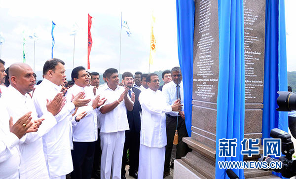 當(dāng)天上午,斯里蘭卡總統(tǒng)西里塞納為拉格勒鎮(zhèn)石碑揭幕,宣布小鎮(zhèn)正式落成。隨后,西里塞納為K壩項(xiàng)目主體工程完工紀(jì)念碑揭幕,并對(duì)中國企業(yè)的付出表示感謝。