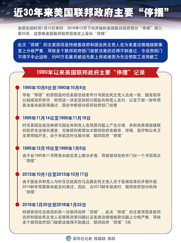 新華社華盛頓1月12日電 新聞背景:近30年來(lái)美國(guó)聯(lián)邦政府主要“停擺”