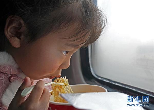 1月21日,在中國鐵路哈爾濱局集團(tuán)有限公司齊齊哈爾客運(yùn)段K497次列車上,一名小女孩在窗邊吃方便面。 新華社記者 才揚(yáng) 攝