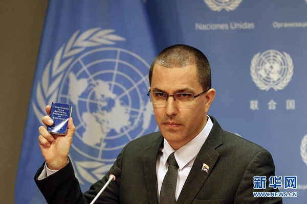 2月12日,在位于紐約的聯(lián)合國總部,委內(nèi)瑞拉外交部長阿雷亞薩出席記者會。新華社記者 李木子 攝
