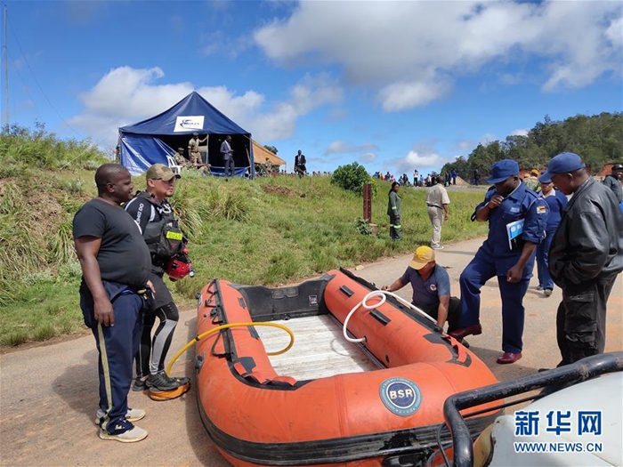 3月20日,在津巴布韋馬尼卡蘭省奇平吉,中國志愿者與當(dāng)?shù)孛癖姙榫仍С錃?。新華社發(fā)