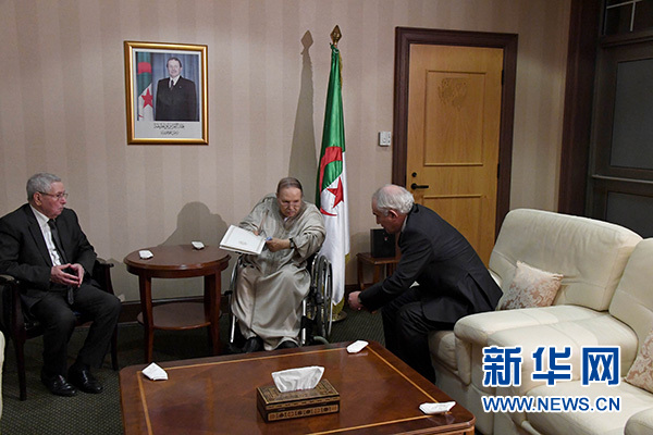 4月2日,在阿爾及利亞首都阿爾及爾,阿爾及利亞總統(tǒng)布特弗利卡(中)遞交辭呈。 新華社發(fā)
