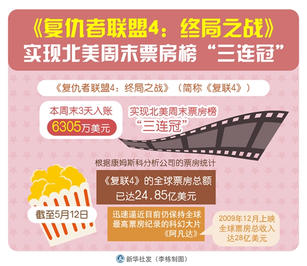 新華社洛杉磯5月12日電(記者高山)盡管面臨強(qiáng)勁挑戰(zhàn),《復(fù)仇者聯(lián)盟4:終局之戰(zhàn)》(簡稱《復(fù)聯(lián)4》)本周末依然憑借3天入賬6305萬美元,實(shí)現(xiàn)北美周末票房榜“三連冠”。