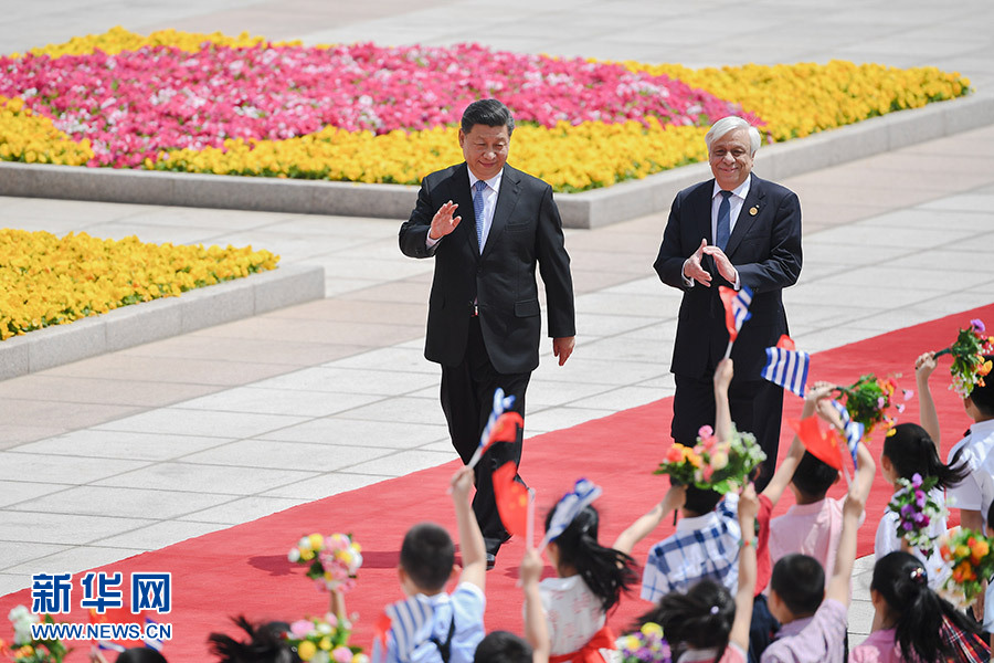 5月14日,國家主席習(xí)近平在北京人民大會堂同希臘總統(tǒng)帕夫洛普洛斯舉行會談。這是會談前,習(xí)近平在人民大會堂東門外廣場為帕夫洛普洛斯舉行歡迎儀式。 新華社記者 張領(lǐng) 攝