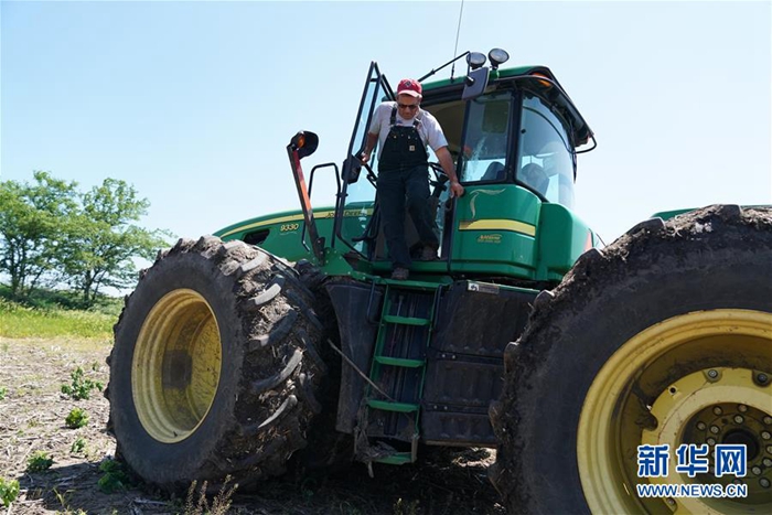 6月10日,在位于美國中部密蘇里州的塔基奧,密蘇里農(nóng)會會長布萊克·赫斯特從一輛拖拉機(jī)上下來。新華社記者 劉杰 攝