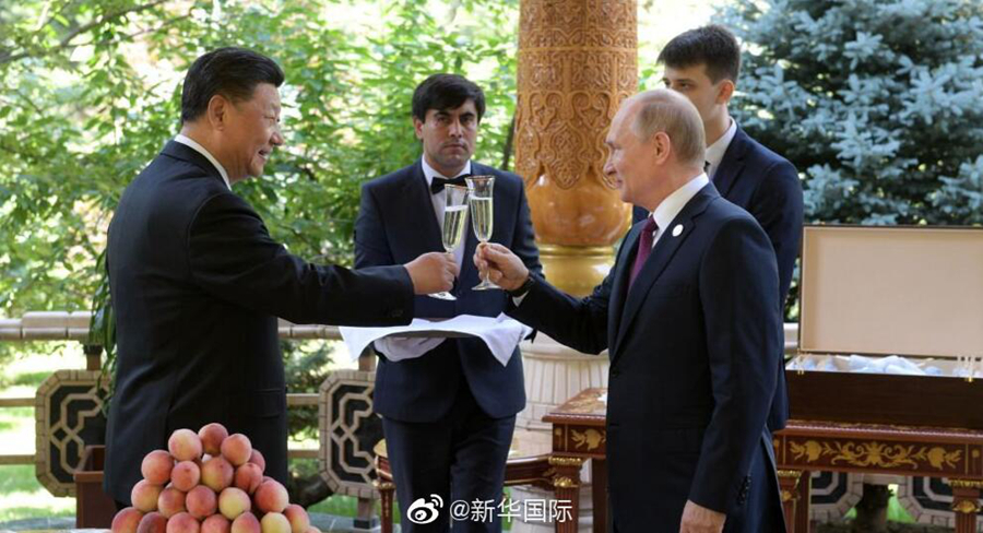 【俄羅斯總統(tǒng)普京當(dāng)面向習(xí)近平主席祝賀生日】俄羅斯塔斯社、俄新社6月15日上午報道稱,據(jù)俄總統(tǒng)新聞秘書佩斯科夫介紹,俄總統(tǒng)普京今天上午在杜尚別出席亞信第五次峰會前親自前往中國國家主席習(xí)近平下榻賓館,當(dāng)面向習(xí)主席祝賀66歲生日。普京高度評價習(xí)主席在俄中關(guān)系發(fā)展中發(fā)揮的重要作用,強(qiáng)調(diào)不久前習(xí)主席對俄進(jìn)行國事訪問取得圓滿成功,相信俄中關(guān)系將繼續(xù)保持良好發(fā)展勢頭。習(xí)主席對普京表示感謝,指出普京在中國很受歡迎。普京總統(tǒng)向習(xí)主席贈送俄羅斯冰淇淋,習(xí)主席回贈中國茶葉。