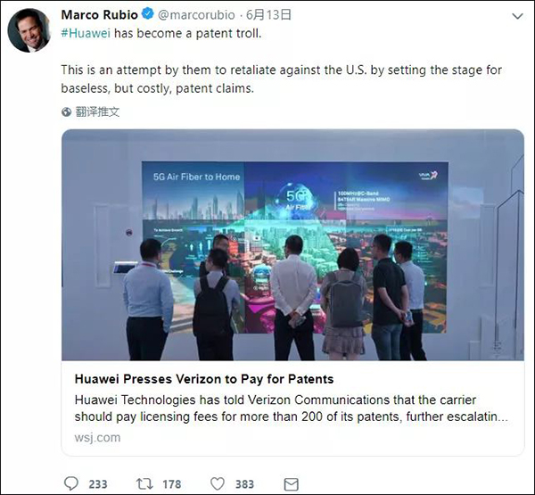 作為美國(guó)反華政客中最激進(jìn)最極端的一個(gè)人,盧比奧多次叫嚷中國(guó)“偷”美國(guó)“知識(shí)產(chǎn)權(quán)”。但是聽到這個(gè)消息后,他立馬撤下了那套“捍衛(wèi)者”的偽裝,給合理維權(quán)的華為扣上“專利流氓”的帽子,還宣稱華為的專利都是“沒有依據(jù)”的。