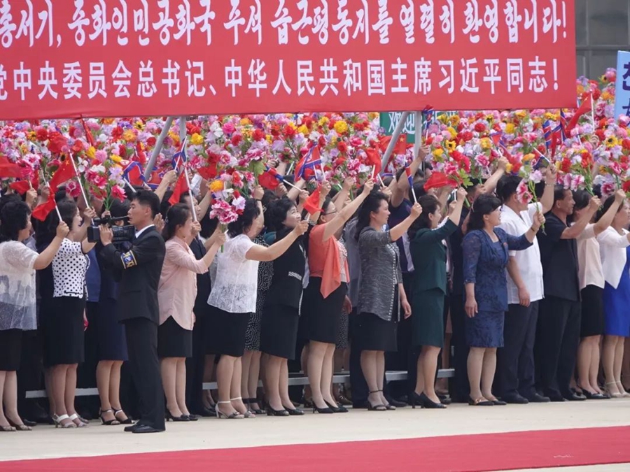 到處都是熱情的笑臉,友好的歡呼聲不絕于耳。習近平和金正恩向歡迎的人群頻頻揮手致意。