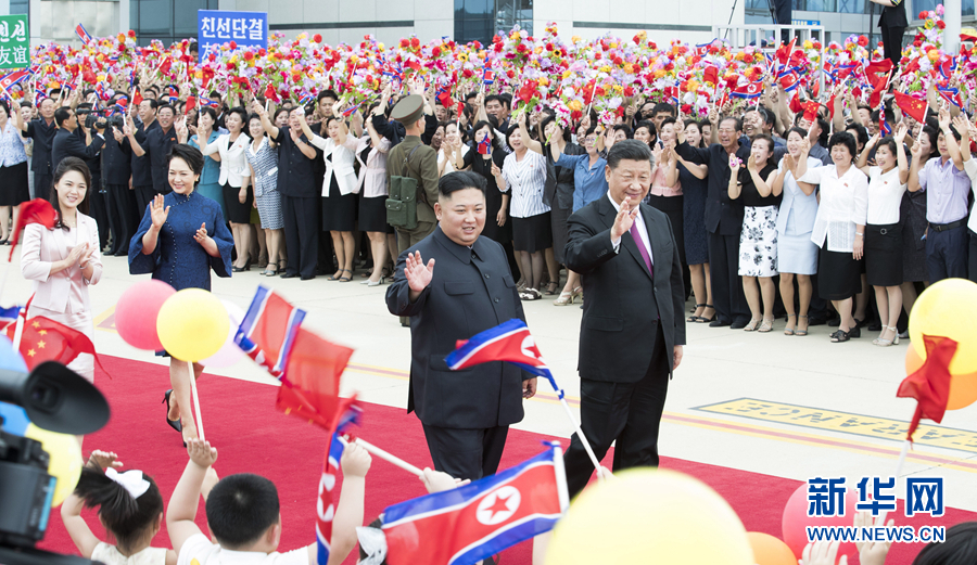 當?shù)貢r間下午3時許,在朝鮮民眾夾道歡送中,習近平和彭麗媛抵達機場,金正恩夫婦在下車處熱情迎接。朝鮮各界群眾在機場熱烈歡送,習近平向他們揮手致意。軍樂隊奏中朝兩國國歌,習近平在金正恩陪同下檢閱了朝鮮人民軍三軍儀仗隊。朝鮮少年兒童向習近平夫婦獻花。習近平同朝方前來送行的高級官員一一握手告別。在專機舷梯旁,習近平同金正恩緊緊握手話別。習近平夫婦邁上舷梯,在機艙門口轉身,向金正恩夫婦揮手告別。