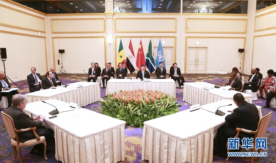 6月28日,國家主席習近平在大阪主持中非領(lǐng)導(dǎo)人會晤。中非合作論壇前任非方共同主席國南非總統(tǒng)拉馬福薩、非洲聯(lián)盟輪值主席國埃及總統(tǒng)塞西、中非合作論壇現(xiàn)任非方共同主席國塞內(nèi)加爾總統(tǒng)薩勒和聯(lián)合國秘書長古特雷斯出席。 新華社記者 龐興雷 攝