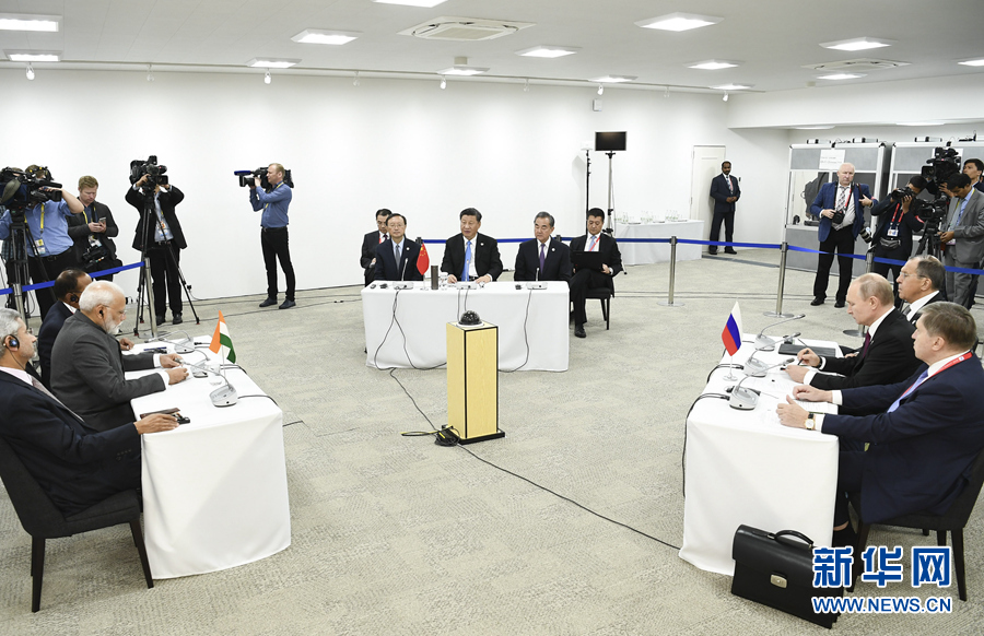 6月28日,國家主席習近平在大阪出席中俄印領導人會晤,同俄羅斯總統(tǒng)普京、印度總理莫迪就當前國際形勢、重大國際和地區(qū)問題、三方合作深入交換意見。 新華社記者 謝環(huán)馳 攝