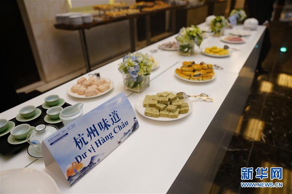 這是7月3日在越南首都河內(nèi)拍攝的推介會(huì)上展出的杭州美食。新華社發(fā)(法鑫 攝)