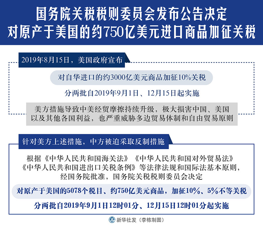 國務院關稅稅則委員會發(fā)布公告決定對原產(chǎn)于美國的約750億美元進口商品加征關稅-新華網(wǎng)