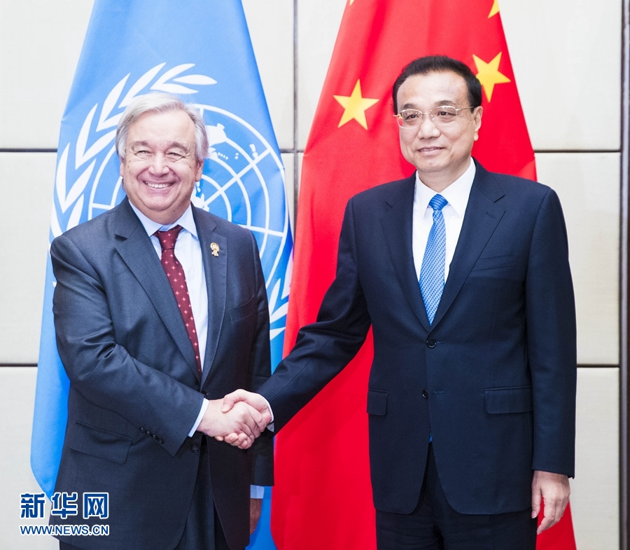 11月3日,國(guó)務(wù)院總理李克強(qiáng)在曼谷會(huì)見聯(lián)合國(guó)秘書長(zhǎng)古特雷斯。 新華社記者 黃敬文 攝
