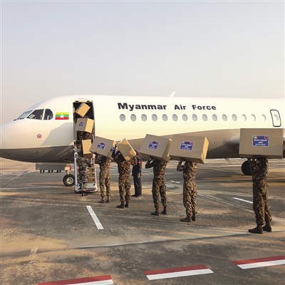 2月25日清晨迎著朝陽,緬甸國防軍使用空軍飛機運送N95級別口罩、護目鏡、防護服等醫(yī)療捐助物資前往中國,旨在幫助中國抗擊新冠肺炎疫情,緬甸國防軍總參謀長妙通烏上將、駐緬甸大使陳海、使館武官熊韶?zé)樀仍趦?nèi)比都機場送行。光明日報駐仰光記者鹿鋮攝/光明圖片