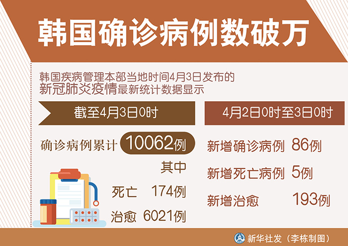 新華社首爾4月3日電(記者陸睿)韓國疾病管理本部3日發(fā)布的新冠肺炎疫情最新統(tǒng)計數(shù)據(jù)顯示,截至3日0時,韓國確診病例累計達(dá)10062例,其中死亡174例,治愈6021例。