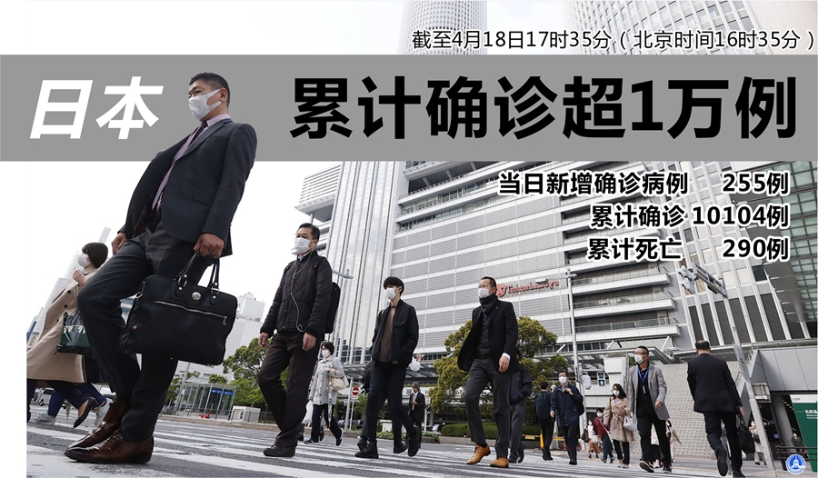 4月18日,在日本東京,行人戴口罩走在澀谷街頭。新華社/共同社