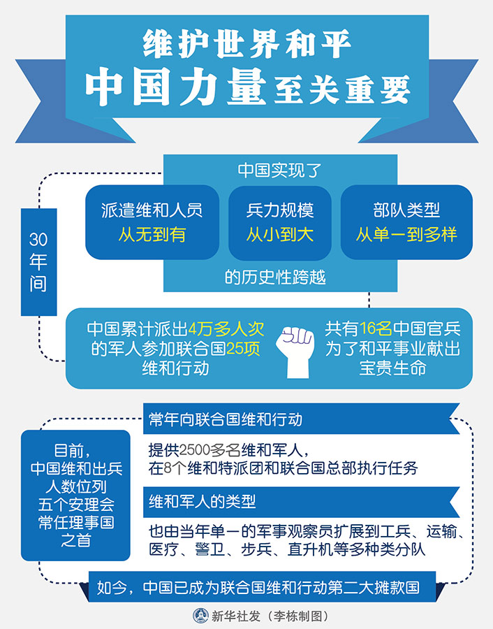 30年間,中國(guó)實(shí)現(xiàn)了派遣維和人員從無(wú)到有、兵力規(guī)模從小到大、部隊(duì)類(lèi)型從單一到多樣的歷史性跨越。30年間,中國(guó)累計(jì)派出4萬(wàn)多人次的軍人參加聯(lián)合國(guó)25項(xiàng)維和行動(dòng),共有16名中國(guó)官兵為了和平事業(yè)獻(xiàn)出寶貴生命。他們,都擁有一個(gè)共同的名字:“中國(guó)藍(lán)盔”。