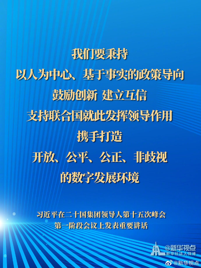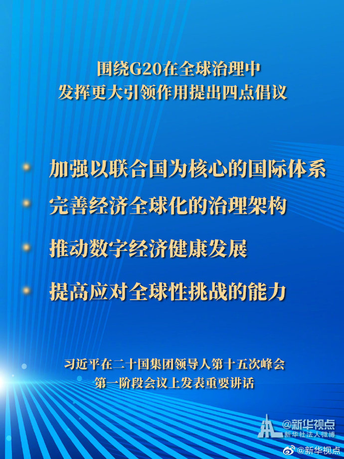 11月21日,國家主席習(xí)近平在二十國集團領(lǐng)導(dǎo)人第十五次峰會第一階段會議上發(fā)表重要講話。一起來看習(xí)主席的G20金句。