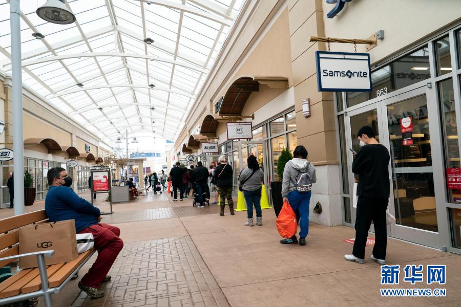 11月27日,人們?cè)诿绹?guó)馬里蘭州國(guó)家港灣一處購(gòu)物中心排隊(duì)等待進(jìn)店購(gòu)物。