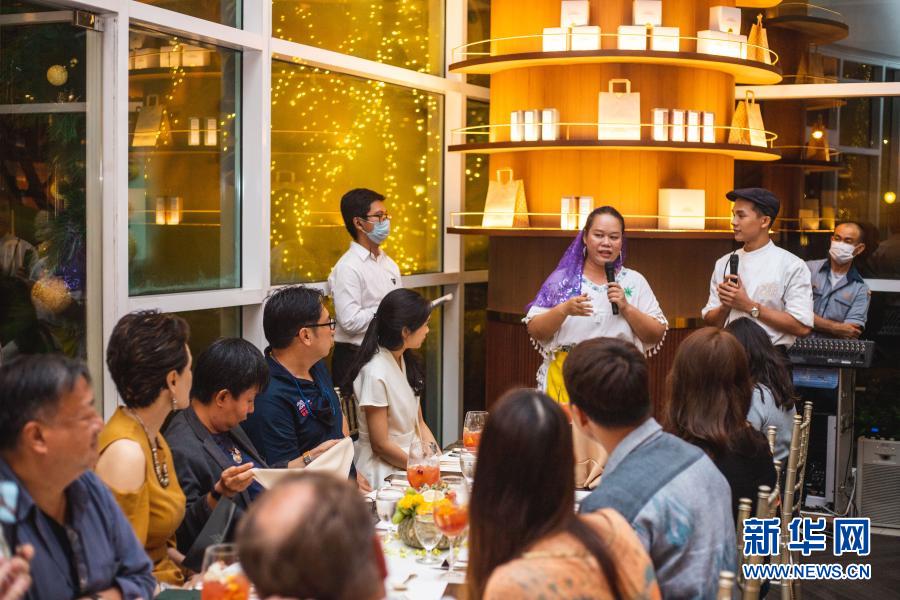 11月23日,廚娘卡妮塔(中)在泰國曼谷天堂酒店向客人介紹她烹制的葡式、泰式和中式風(fēng)味的融合菜。新華社記者 陳家寶 攝
