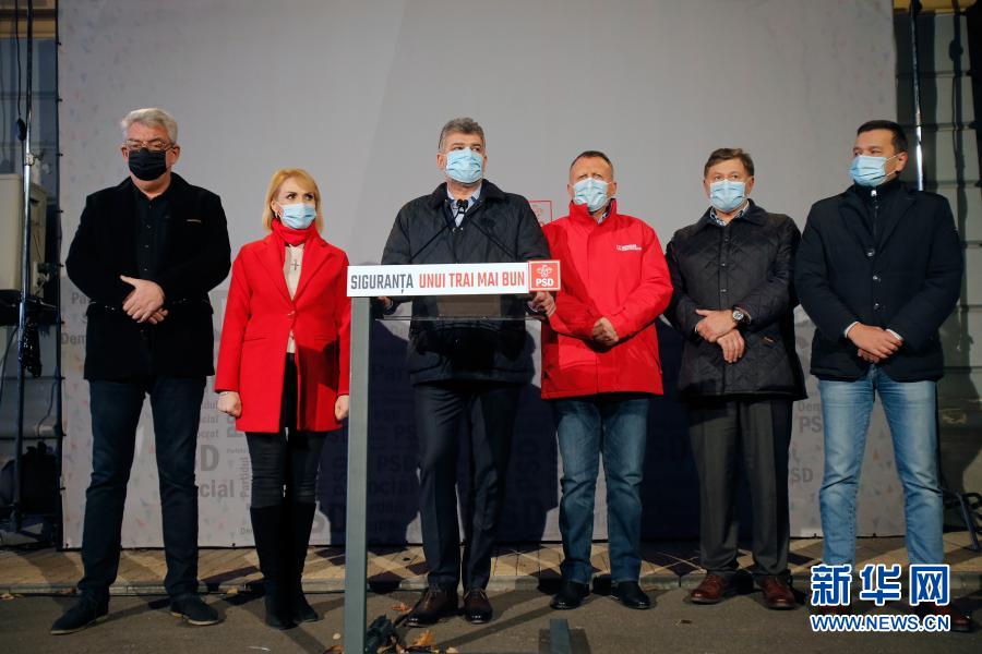 12月6日,在羅馬尼亞首都布加勒斯特,羅馬尼亞最大反對(duì)黨社會(huì)民主黨主席喬拉庫(kù)(左三)向媒體發(fā)表講話。新華社發(fā)(克里斯泰爾攝)