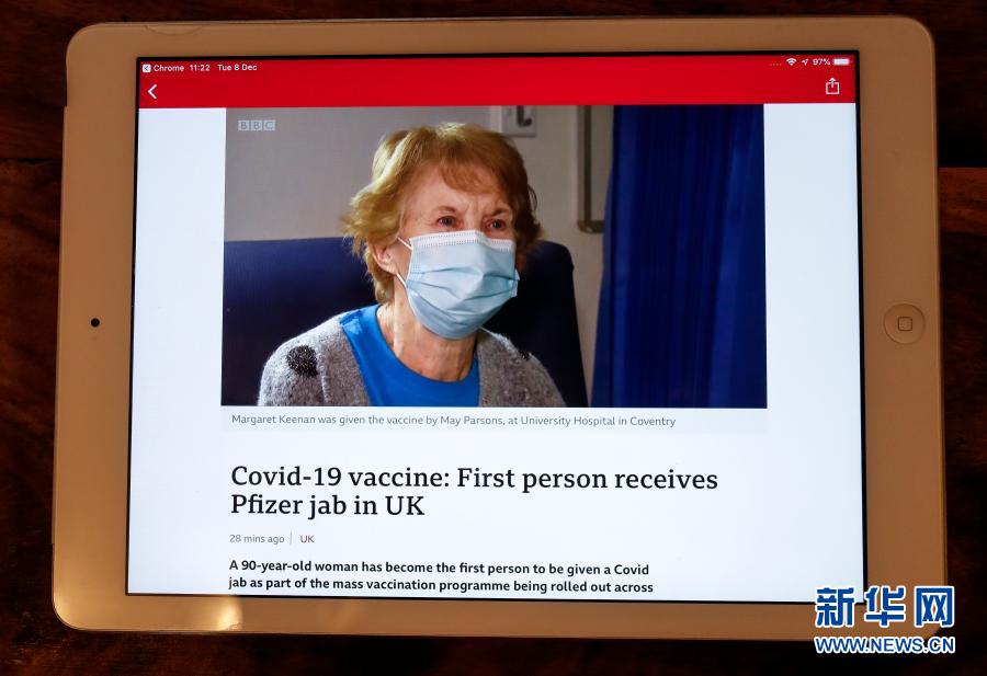 12月8日在英國倫敦拍攝的播放新聞的電腦屏幕顯示,90歲女子瑪格麗特·基南成為該國首位接種新冠疫苗的人。