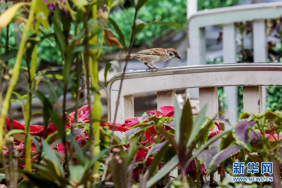 3月18日,在位于馬尼拉的菲律賓大學(xué)附屬菲律賓總醫(yī)院,一只麻雀站在“低語(yǔ)的花床”藝術(shù)裝置上。