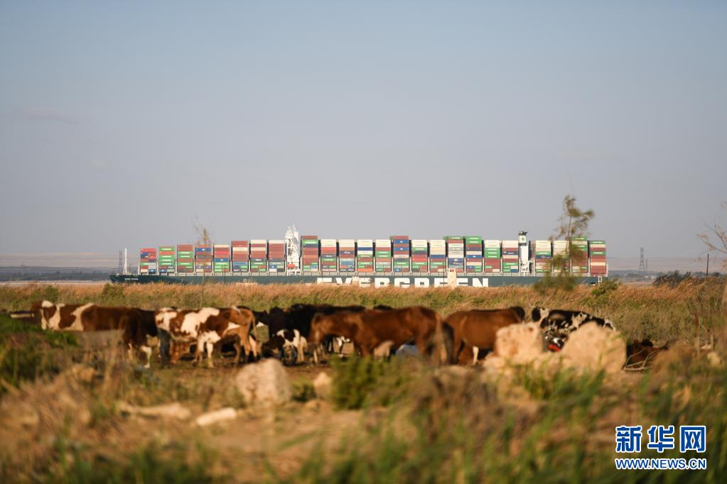 這是3月29日拍攝的移動至埃及蘇伊士運(yùn)河正常航道上的重型貨輪。